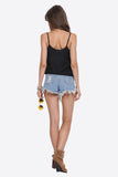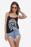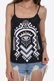 This lovely top is perfect for summer or springtime. Pair it with your favorite jean shorts for a great outfit! This spaghetti strapped top features an all over inspired design on a black background, a lightly banded bustline.One size fits most.
